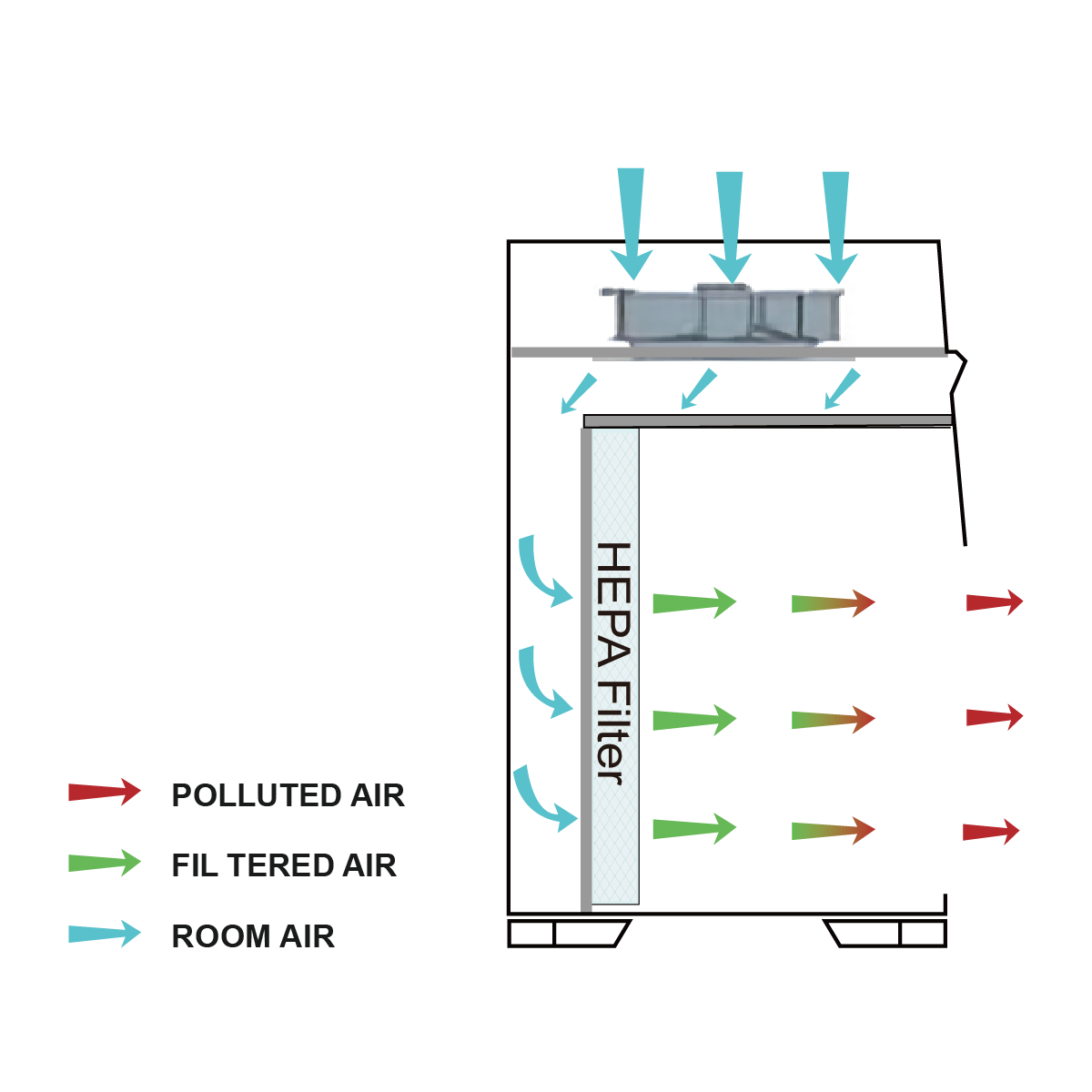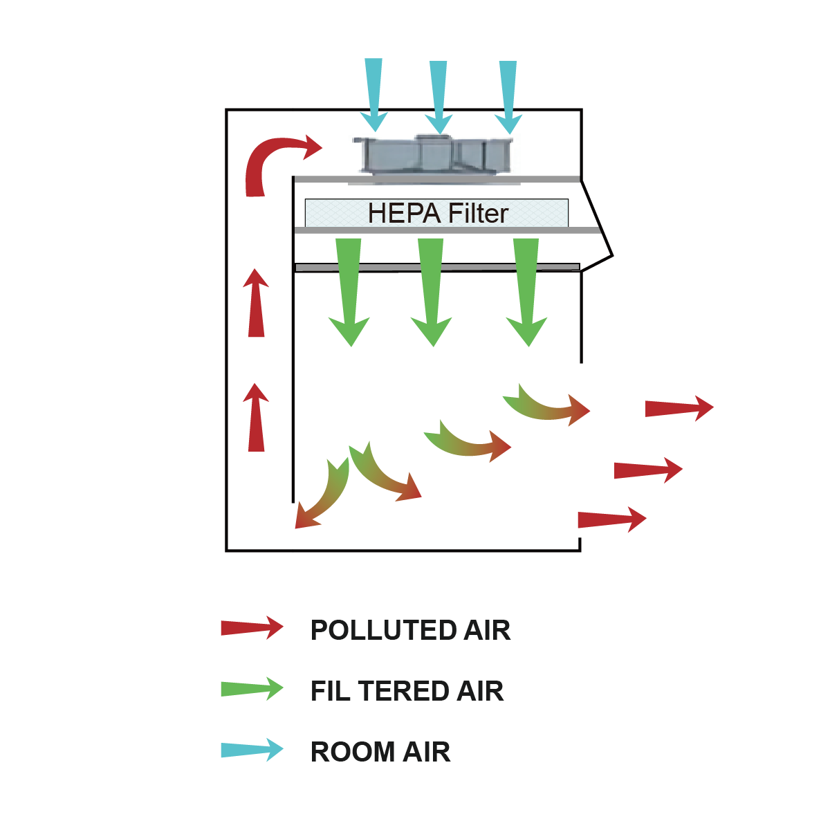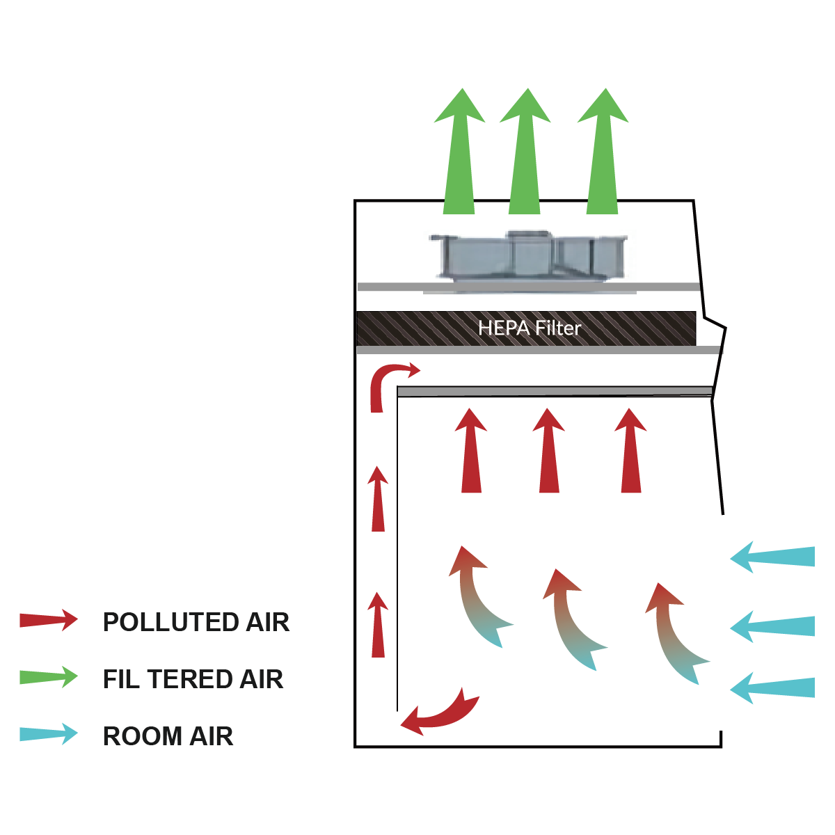 | Uses HEPA filters used to filter both incoming air and outgoing air (Class I) | ||