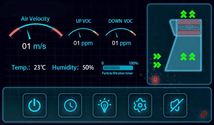 7-inch color touch screen, real-time display air velocity, VOC concentration, temperature and humidity, and filter life time etc |