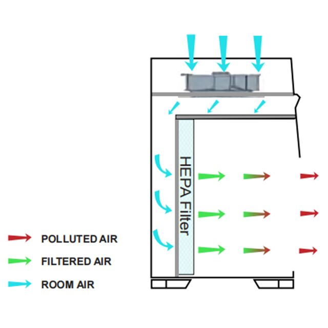 The horizonta laminar airflow (Class 100) operates on the principle of downward airflow. Clean air enters the room through HEPA filters installed in the ceiling, then flows downwards in a laminar pattern towards the floor. Finally, the air is exhausted from the room through a grated floor system.