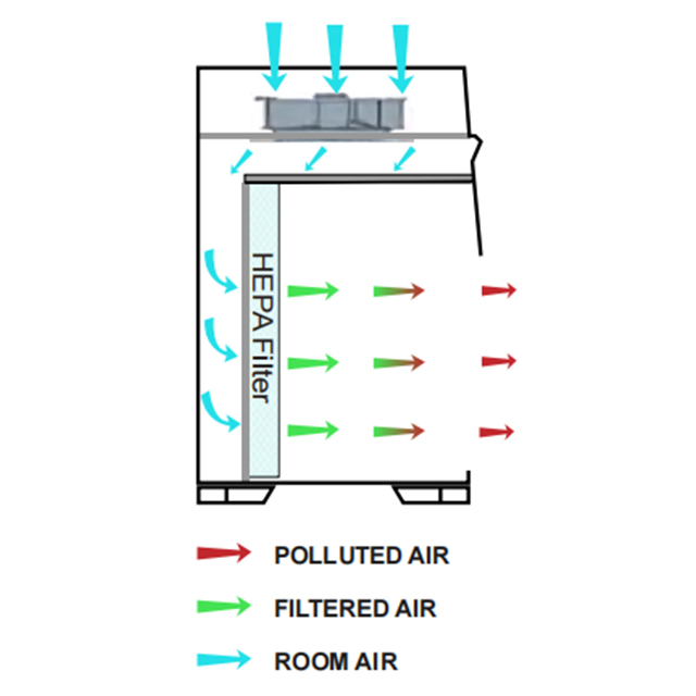 The vertical laminar airflow (Class 100) operates on the principle of downward airflow. Clean air enters the room through HEPA filters installed in the ceiling, then flows downwards in a laminar pattern towards the floor. Finally, the air is exhausted from the room through a grated floor system.
