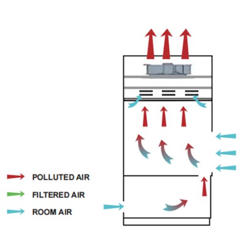 | Partial air circulation | Perforations at the back wall of the work zone which are designed to eliminate air turbulence and the possibility of dead air corners in the work zone. | |